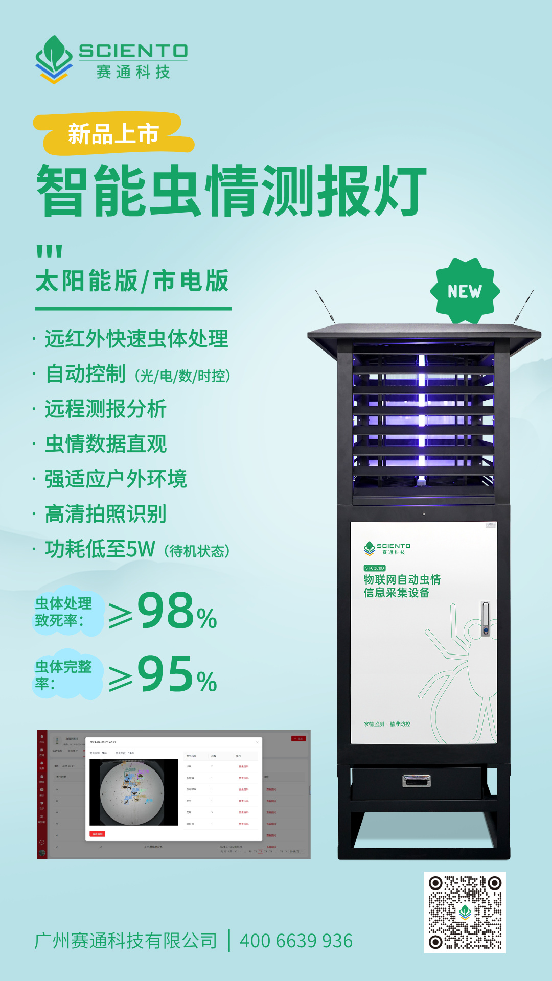 当农田虫情监测还在依赖“人工巡查+毒瓶杀虫”的传统模式,当林业虫害预警因数据滞后错过最佳防控期,广州赛通科技有限公司重磅推出智能虫情测报灯新品,为农情防控注入智能新动力!